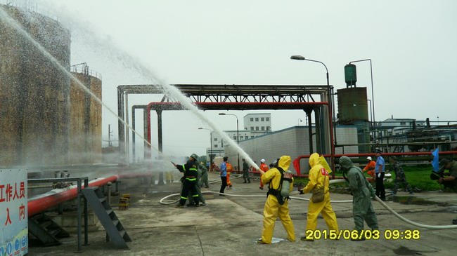 演练以天润公司原料储罐区发生危险化学品泄漏事故为背景,在应急救援指挥部现场指挥人员指挥下,各参演小组按照各自的分工迅速进行了区域警戒、人员疏散、火灾控制、事故处置等演练,整个演练计划周密,各环节衔接顺畅,达到了预期效果。
