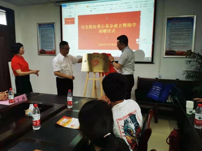 仪式现场,佳先股份副总经理、工会主席丁柱介绍了公司发展及参与公益事业的情况;区委常委、常务副区长程旭和佳先股份董事长李兑共同为“佳先股份爱心基金”揭牌;佳先股份爱心基金向沫河口镇学生捐赠10万元。