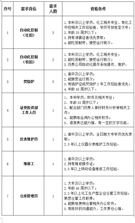 根据公司项目建设和夏季大修技改后生产相关配套工作的需要,结合目前各部门人员现状,为了保障公司的新项目工作的顺利进行,现面向社会公开招聘14名工作人员,具体事项公告如下:
